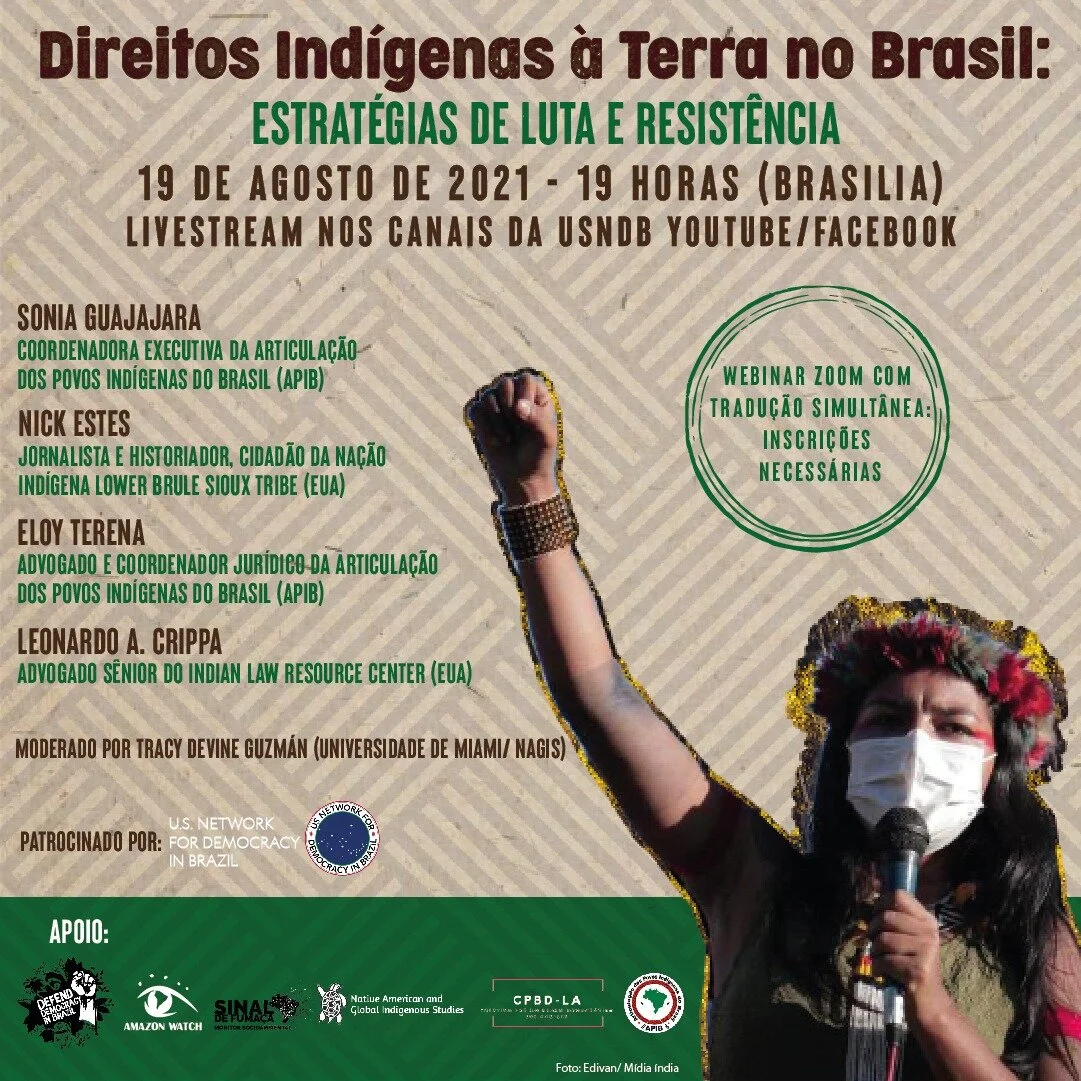 The Working Group on Indigenous Rights of the U.S. Network for Democracy in Brazil invites scholars, activists, students, journalists, community leaders, and other supporters of Indigenous Rights to join in conversation with Sonia Guajajara, Executive coordinator of Articulation of Indigenous Peoples in Brazil (APIB); Eloy Terena, attorney and legal coordinator of APIB; Nick Estes, journalist, historian, citizen of the Lower Brule Sioux Tribe, and Leonardo A. Crippa, senior attorney at the Indian Law Resource Center (USA), to discuss the urgent challenges at hand, as well as strategies for protecting Indigenous ancestral lands.